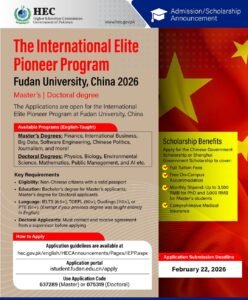 The Applications are open for the International Elite Pioneer Program at Fudan University, China. Available Programs (English-Taught) • Master's Degrees: Finance, International Business, Big Data, Software Engineering, Chinese Politics, Journalism,